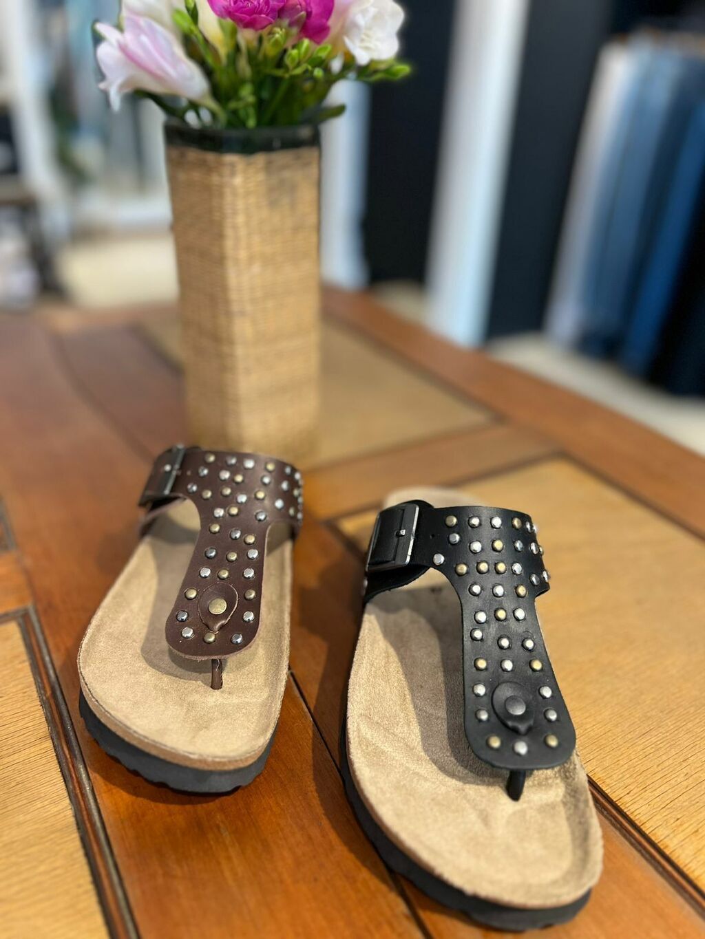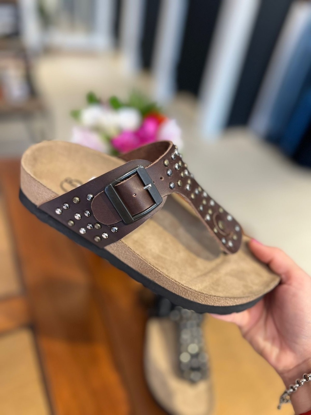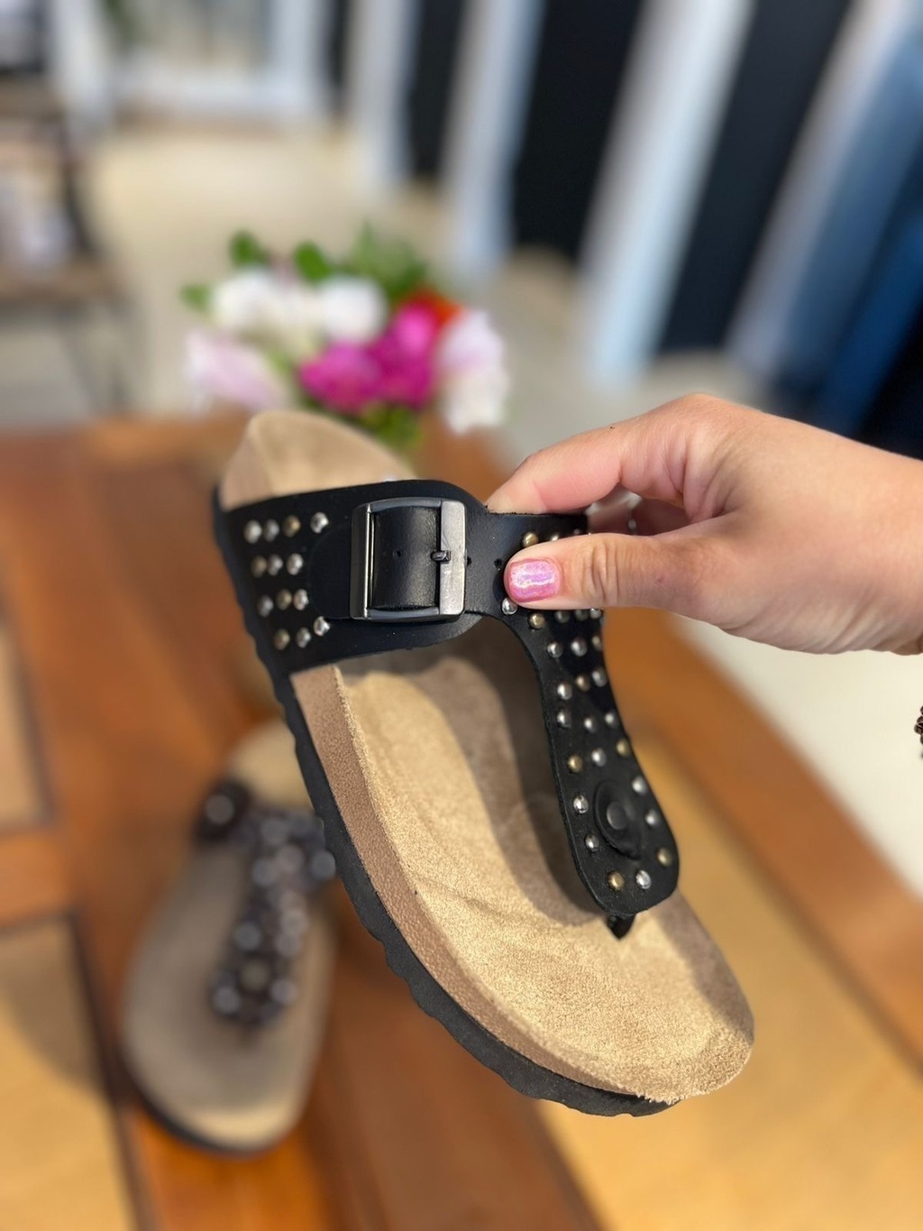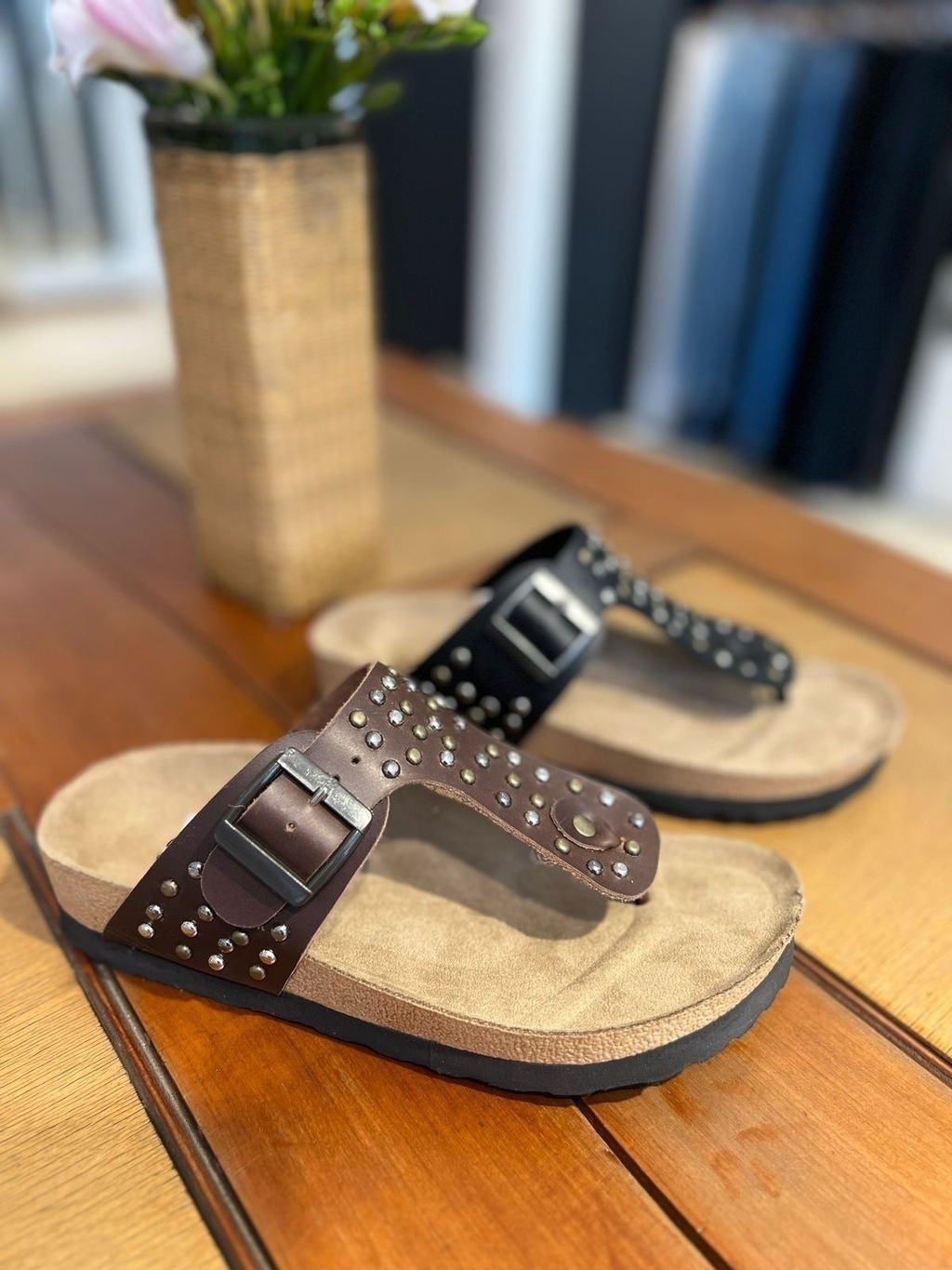 La capellada es de cuero con tachas metalicas, que dan un toque canchero y moderno. El modelo incluye una hebilla regulable que permite ajustar el calce y un detalle central con aplique metalico que realza su diseño.