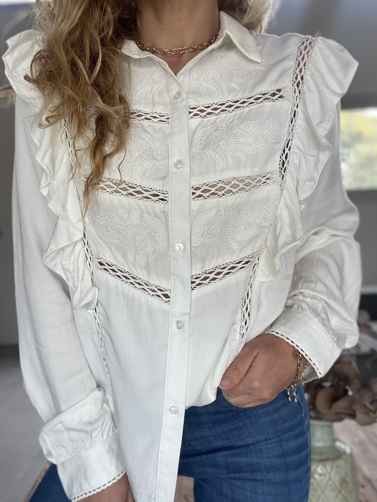 Descubrí esta camisa importada de algodón, diseñada con manga larga y detalles que marcan la diferencia. Presenta volados, bordados y puntilla en la parte delantera, junto con un delicado detalle de puntilla en los puños. La espalda cuenta con recortes que le aportan un toque moderno y sofisticado.