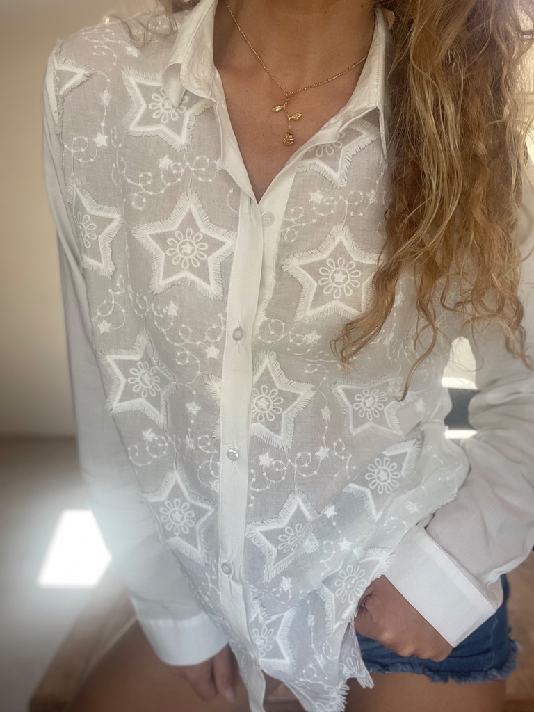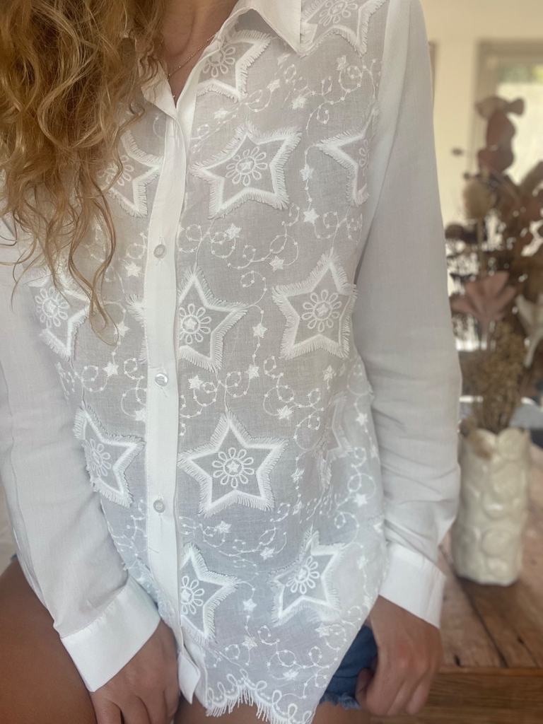 Te presentamos la Camisa Salomé, confeccionada en algodón de alta calidad con delicados apliques y bordados que realzan su diseño. La terminación en puntilla aporta un toque femenino y elegante, mientras que las mangas y la espalda lisas brindan un estilo sobrio y versátil.